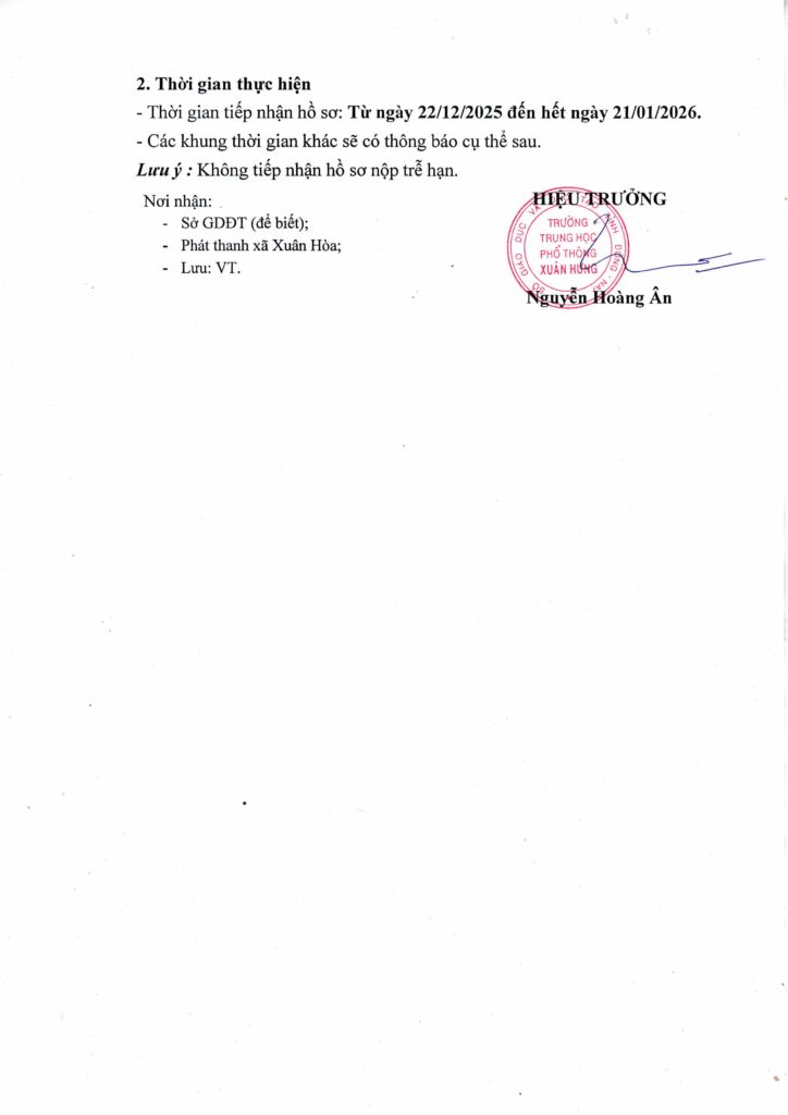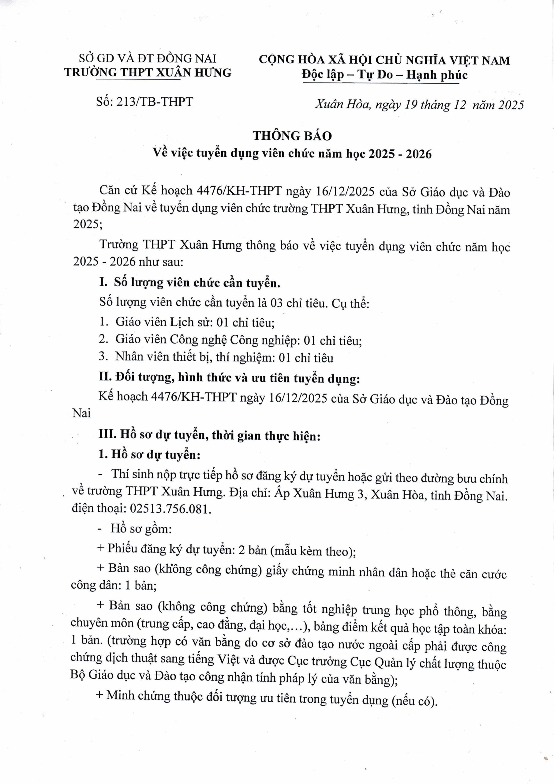 Trường Trung học phổ thông Xuân Hưng trân trọng thông báo tuyển dụng giáo viên THPT (01 Giáo viên Lịch sử và 01 Giáo viên Công nghệ công nghiệp) và Nhân viên cho năm học 2025–2026, giảng dạy theo Chương trình Giáo dục Phổ thông 2018 của Bộ Giáo dục & Đào tạo.
